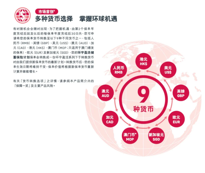 香港友邦环宇盈活储蓄保险计划,可从第 2 个保单年度起转换 9 种货币。
