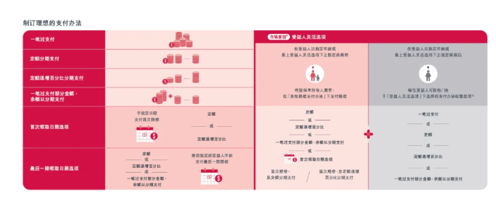 市场罕有:从第 5 个保单年度完结后或保费缴付期完结后(以较后者为准)起,可申请设立指示,在指定期间内定期提取保单价值,并指定收取款项对象,可随时及不限次数更改收取款项对象及 / 或付款次数。