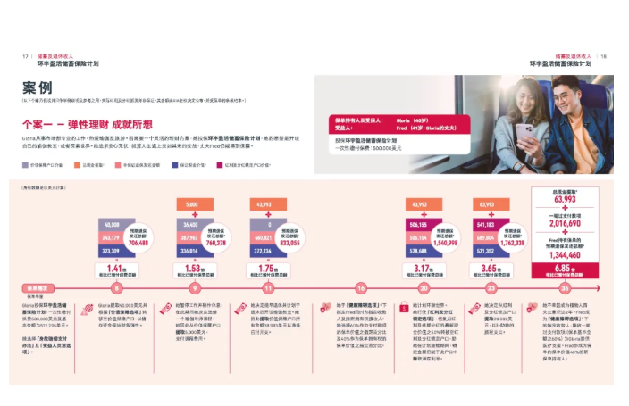 主角是 40 岁的 Gloria 和她 41 岁的丈夫 Fred 。Gloria 一次性缴付 50 万美元保费,通过不同保单年度的操作(如价值保障选项转换、提取等 ),实现弹性理财目标。