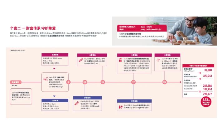 这是环宇盈活储蓄保险计划的财富传承案例二,主角是父亲 Gavin(35 岁 )和儿子 Greg(5 岁 ),年保费 4200 美元,5 年交完,总保费 201000 美元,按时间线看财富传承运作。