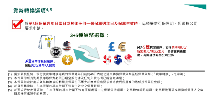 「隽富多元货币计划」让您在投保时享有多达6种货币选择,并且可灵活转换货币,迎合当前变化趋势。 下面就来聊聊隽富的九大功能: 一、多种保单货币选择 6种货币:人民币、美元、港元、英镑、加元、澳元。 转换时间:第3个保...